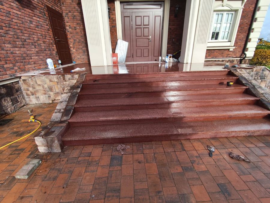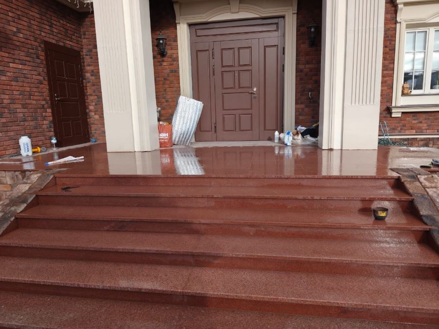 Гранитные плиты используются непосредственно для отделки ступеней, а также для облицовки площадки крыльца, для оформления входа в здание, для укладки небольшой площадки перед крыльцом. Для каждого объекта разрабатывается персональный дизайнерский проект.
