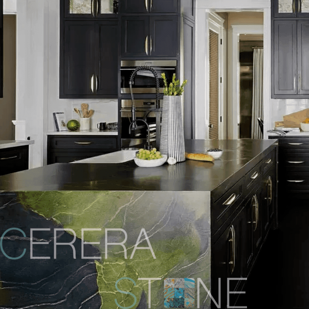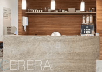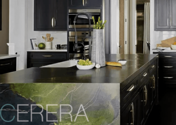 Кварц – это агломерированный камень, полученный искусственным путем, но с использованием натурального песка. Это измельченная в мелкую фракцию горная порода, которая прошла процесс термического воздействия с добавлением прочных полиэфирных смол. Получается большой слэб, готовый для дальнейшей резки на столешницы, плитку, ступени. В качестве добавок используют кварцит, мрамор, гранит. Внедрение природных компонентов придают искусственному камню определенный оттенок.