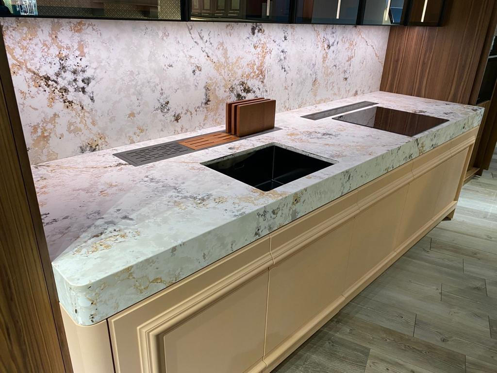 Из минусов – уступает кварцевому камню в термостойкости. Если поставить раскаленный предмет, могут остаться следы. Относительная мягкость поверхности – ещё одна особенность, которая требует бережного отношения, аккуратной работы с острыми столовыми приборами, использования разделочных досок.